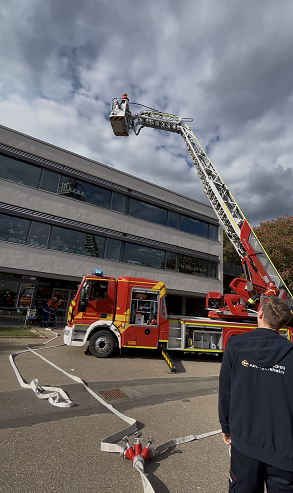 Den ersten „Einsatz“ bestritten die Jugendlichen zusammen mit der Feuerwehr Bad Mergentheim mit der dortigen Drehleiter. Gemeldet war eine Rauchentwicklung auf dem Grundschulgebäude Igersheim. (auch im Jugendbereich zeigt sich die gute interkommunale Zusammenarbeit).