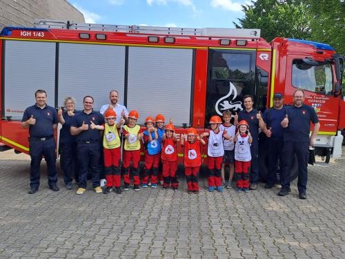 Mit den Leibchen konnten sich die Kinder gleich nach der Übergabe in einem kleinen Löschangriff besser mit ihrer Aufgabe identifizieren: gehöre ich zum Schlauchtrupp, zum Angriffstrupp oder zum Wassertrupp? Die Beschriftung im Comic-Style hilft den Kindern, sich die Funktionen einfacher zu merken.