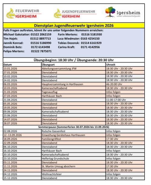 Wir treffen uns alle zwei Wochen für zwei Stunden. Unsere regulären Dienstabende starten immer um 18:30 Uhr und enden ca. um 20:30 Uhr. Über löschen, funken und erste Hilfe bis hin zur Fahrzeug- und Knotenkunde ist bei uns alles dabei. Natürlich gibt es bei uns auch verschiedene Feiern wie z.B. Grillabende, verschiedene Ausflüge oder Weihnachtsfeiern.